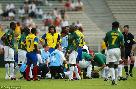 Marc-Vivien FOE s'est écroulé tout seul à la 72ème minute. Intransportable en l'état à l'hôpital, il a été conduit au bloc médical du stade ou les médecins ont tenté, en vain, de le ranimer.