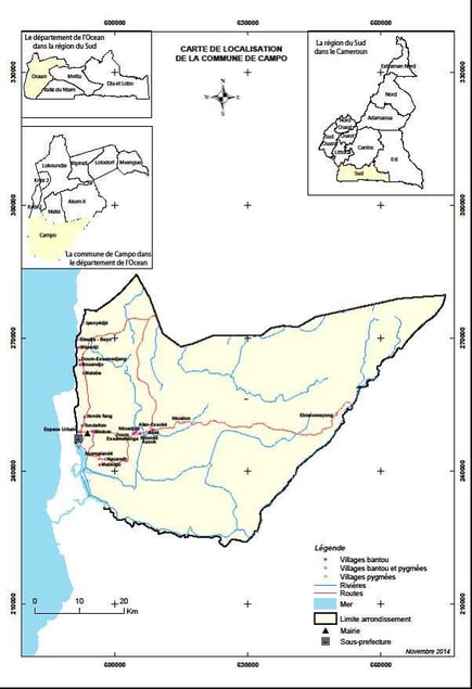 Date de création : 1961 Chef lieu : Bokombe Contact : Tél: E-mail : Limites géographiques : La Commune de Campo est située à 77 Km de la ville de Kribi et s’étend sur 3 135 kKm² et compte 17 villages dont 06 disposant chacun d’un campement pygmée ainsi que 10 quartiers urbains. Elle est limitée :